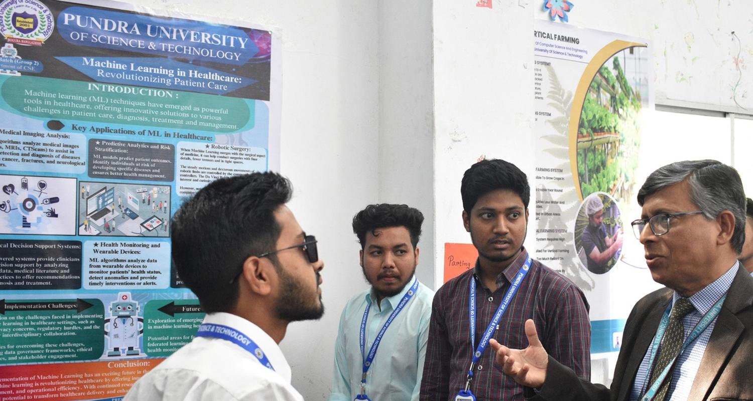 চতুর্থ শিল্প বিপ্লব এর সঙ্গে তাল মিলিয়ে সার্বিকভাবে নিজেদেরকে আরও কিভাবে প্রস্তুত করা যায় তার অনুশীলনের অংশ হিসেবে পুণ্ড্র ইউনিভার্সিটি অব সায়েন্স অ্যান্ড টেকনোলজির কম্পিউটার সায়েন্স অ্যান্ড ইঞ্জিনিয়ারিং (সিএসই) বিভাগের বিভিন্ন ব্যাচের শিক্ষার্থীরা পোস্টার উপস্থাপন করেছে। ০৯ মার্চ ২০২৪ শনিবার সকাল ১০টায় বিশ্ববিদ্যালয় মিলনায়তনে উপাচার্য প্রফেসর ড. চিত্তরঞ্জন মিশ্র পোস্টার গুলো ঘুরে ঘুরে দেখেন। এসময় তার সাথে উপস্থিত ছিলেন বিশ্ববিদ্যালয়ের ট্রেজারার প্রফেসর মুহা: সুজন শাহ-ই ফজলুল, বিজ্ঞান ও প্রকৌশল অনুষদের ডিন, প্রফেসর ড. খাজা জাকারিয়া আহমদ চিশতী এবং সিএসই বিভাগের প্রধান মোঃ হাবিব এহসানুল হক।