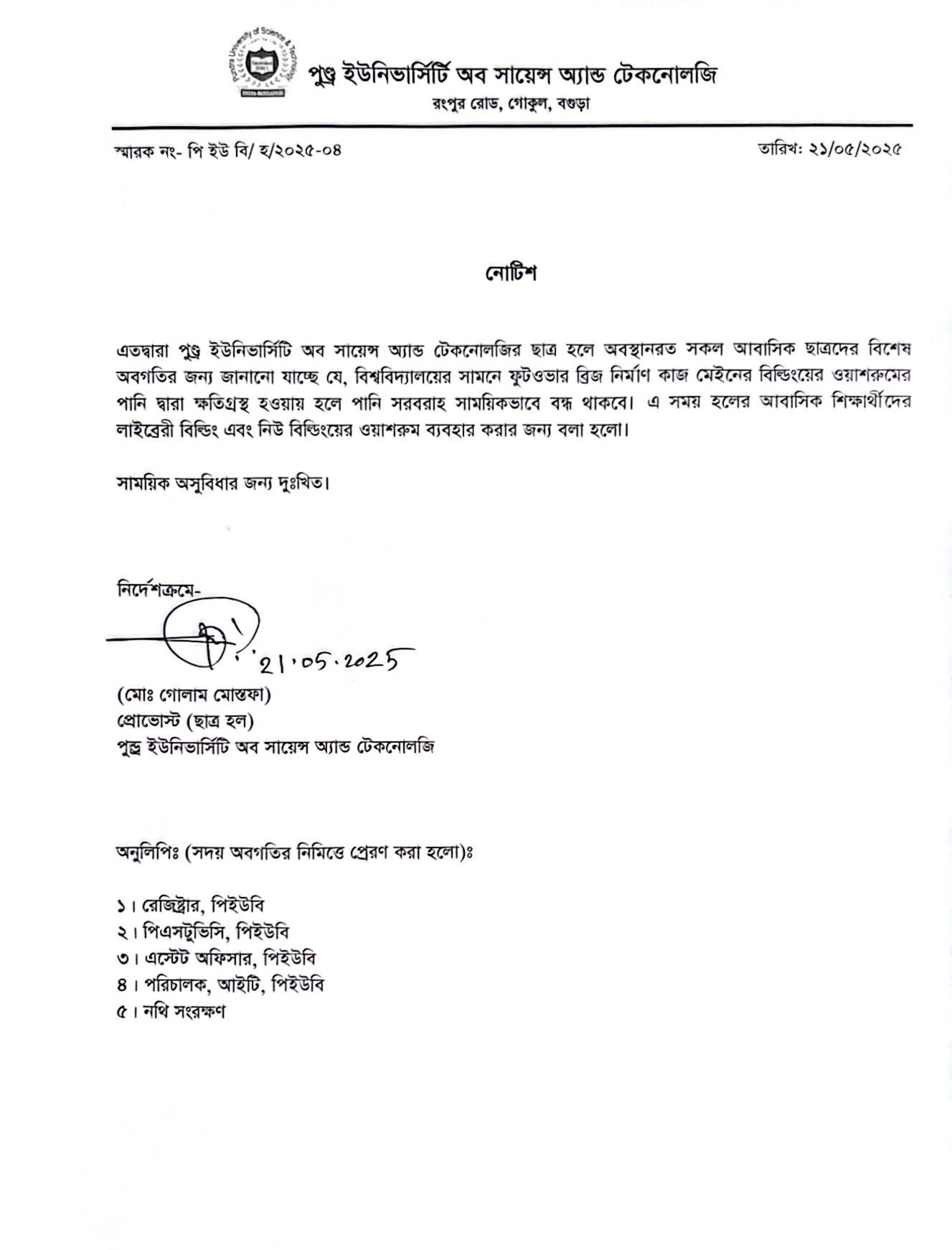 ছাত্র হলের পানি সরবরাহ বন্ধ প্রসঙ্গে..