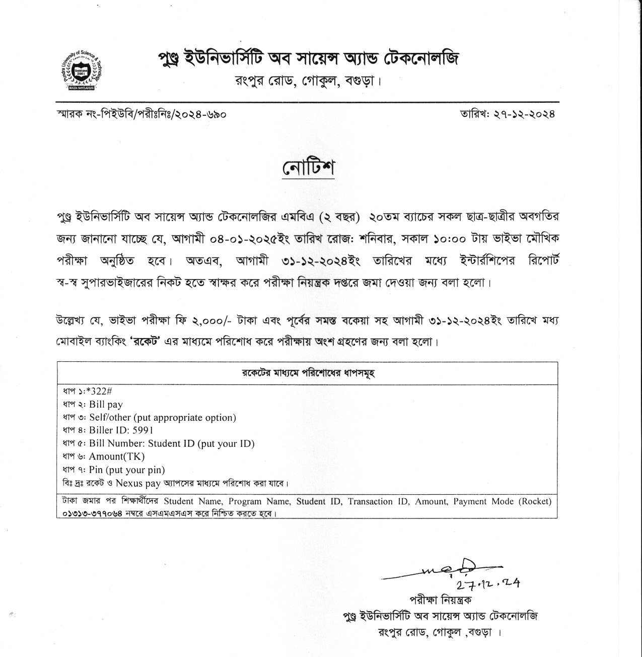 পুণ্ড্র ইউনিভার্সিটি অব সায়েন্স অ্যান্ড টেকনোলজি’র এমবিএ (২ বছর) প্রোগ্রামের ২০তম ব্যাচের সকল ছাত্র-ছাত্রীদের মৌখিক পরীক্ষা ও ইন্টার্নশিপ এর রিপোর্ট প্রসঙ্গে।
