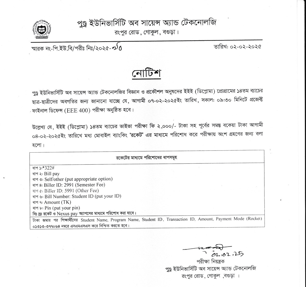 পুণ্ড্র ইউনিভার্সিটি অব সায়েন্স অ্যান্ড টেকনোলজির ইইই (Diploma) ১৪ তম ব্যাচের সকল ছাত্র-ছাত্রীদের প্রজেক্ট ফাইনাল ডিফেন্স পরীক্ষা প্রসঙ্গে