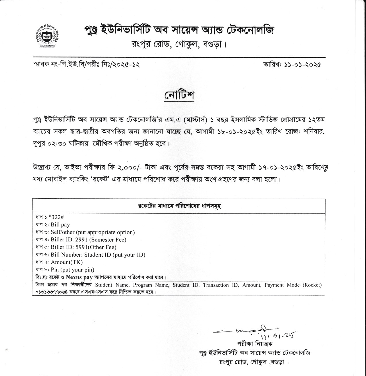 পুণ্ড্র ইউনিভার্সিটি অব সায়েন্স অ্যান্ড টেকনোলজির এম.এ (মাস্টার্স) ০১ বছর ইসলামিক স্টাডিজ প্রোগ্রামের ১২ তম ব্যাচের সকল ছাত্র-ছাত্রীদের মৌখিক পরীক্ষা প্রসঙ্গে।