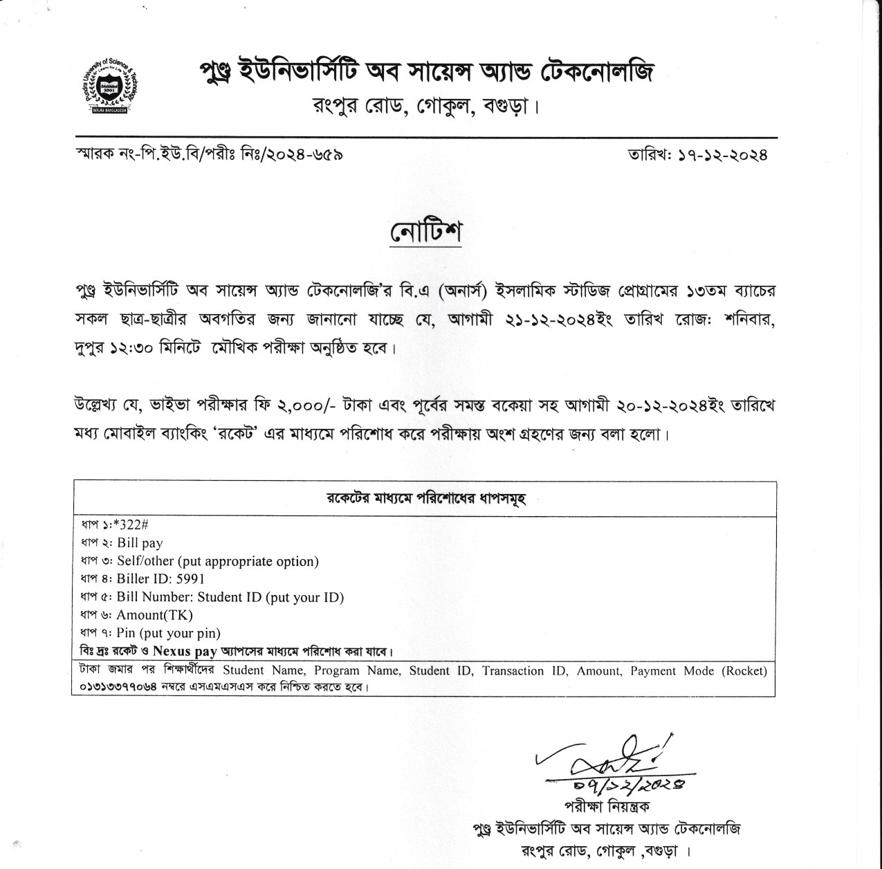 পুণ্ড্র ইউনিভার্সিটি অব সায়েন্স অ্যান্ড টেকনোলজি'র বি.এ (অনার্স) ইসলামিক স্টাডিজ প্রোগ্রামের ১৩তম ব্যাচের সকল ছাত্র-ছাত্রীদের মৌখিক পরীক্ষা প্রসঙ্গে।