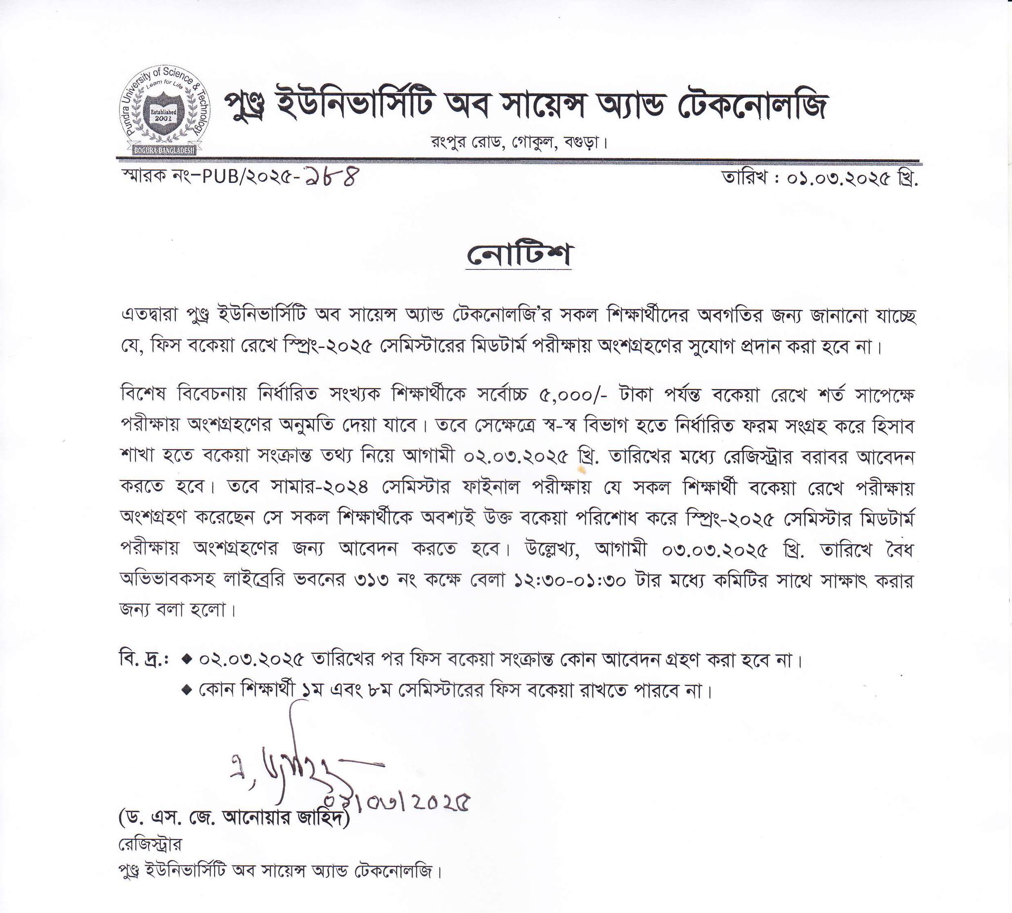 ফিস বকেয়া রেখে স্প্রিং-২০২৫ সেমিস্টারের মিডটার্ম পরীক্ষায় অংশগ্রহনের সু্যোগ প্রদান করা হবে না প্রসঙ্গে