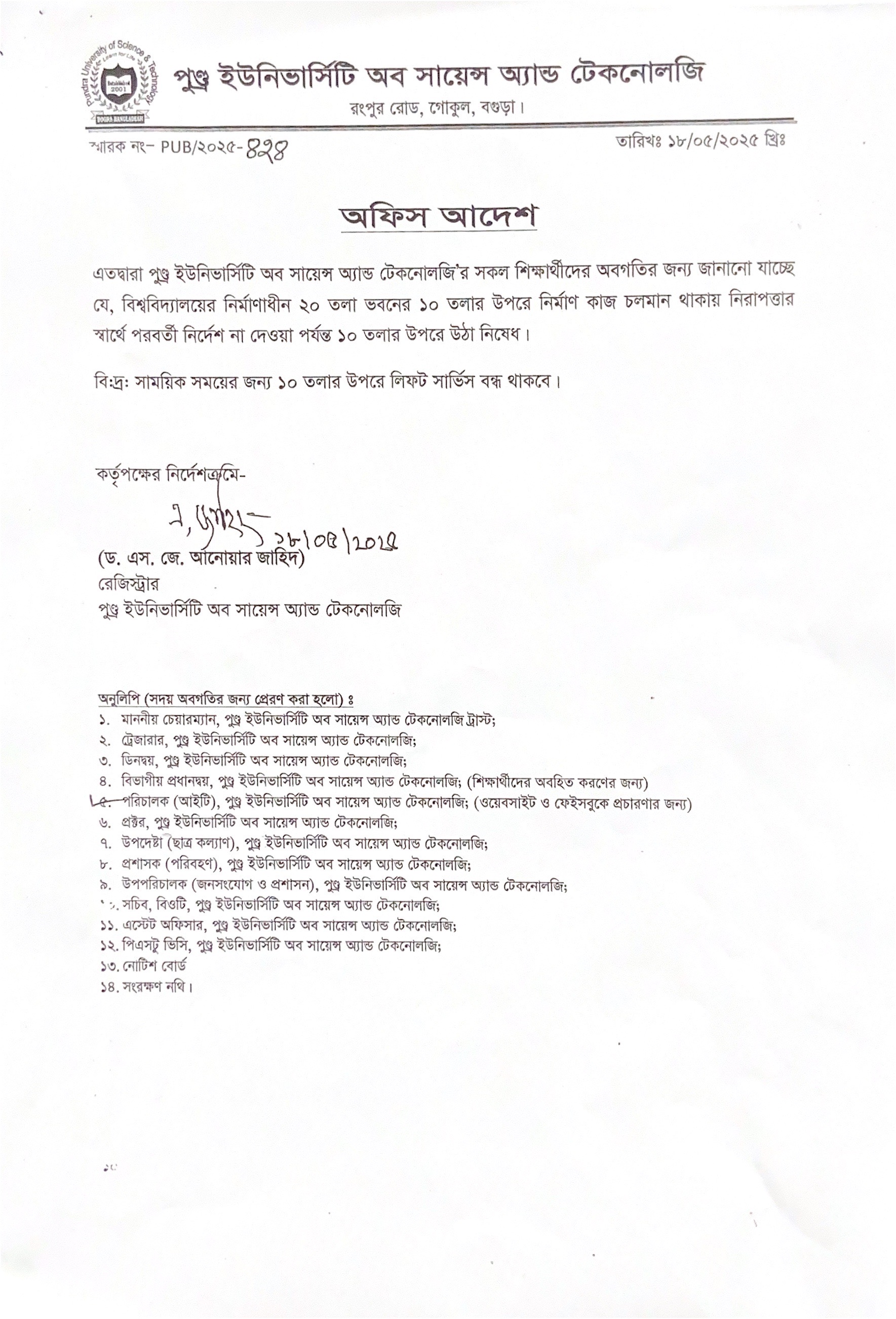 সাময়িক সময়ের জন্য ১০ তলার উপরে লিফট সার্ভিস বন্ধ থাকা প্রসঙ্গে..