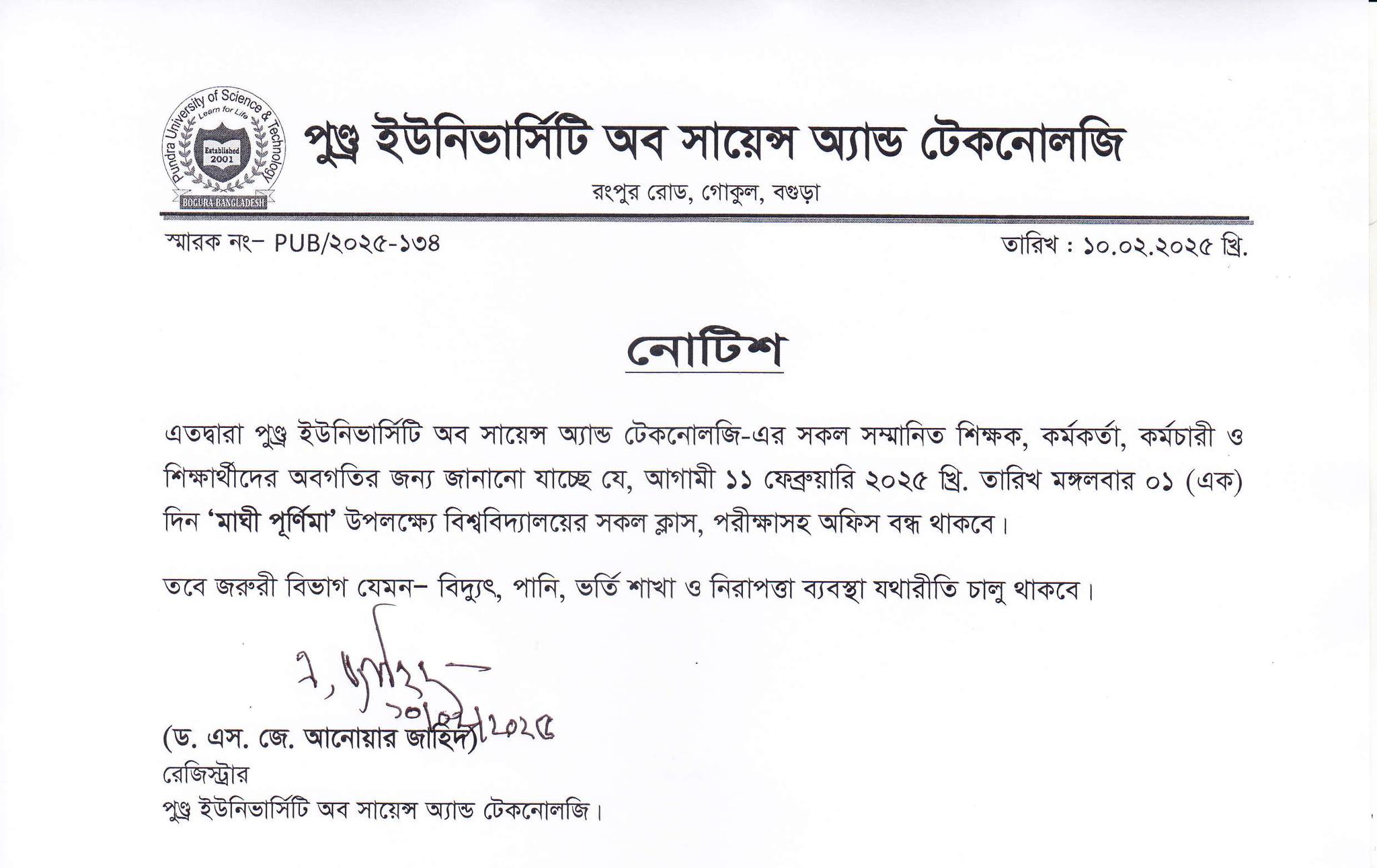 ১১ ফেব্রুয়ারি ২০২৫ তারিখ মঙ্গলবার ০১ (এক) দিন “মাঘী পূর্ণিমা” উপলক্ষে পুণ্ড্র ইউনিভার্সিটি অব সায়েন্স অ্যান্ড টেকনোলজি’র অফিস, ক্লাশ ও পরীক্ষাসমূহ বন্ধ থাকা প্রসঙ্গে।