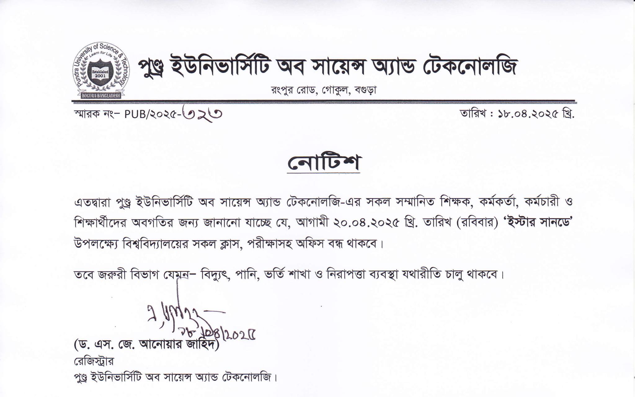 ২০.০৪.২০২৫ তারিখ (রবিবার) “ইস্টার সানডে” উপলক্ষে পুণ্ড্র ইউনিভার্সিটি অব সায়েন্স অ্যান্ড টেকনোলজি’র অফিস, ক্লাশ ও পরীক্ষাসমূহ বন্ধ থাকা প্রসঙ্গে।