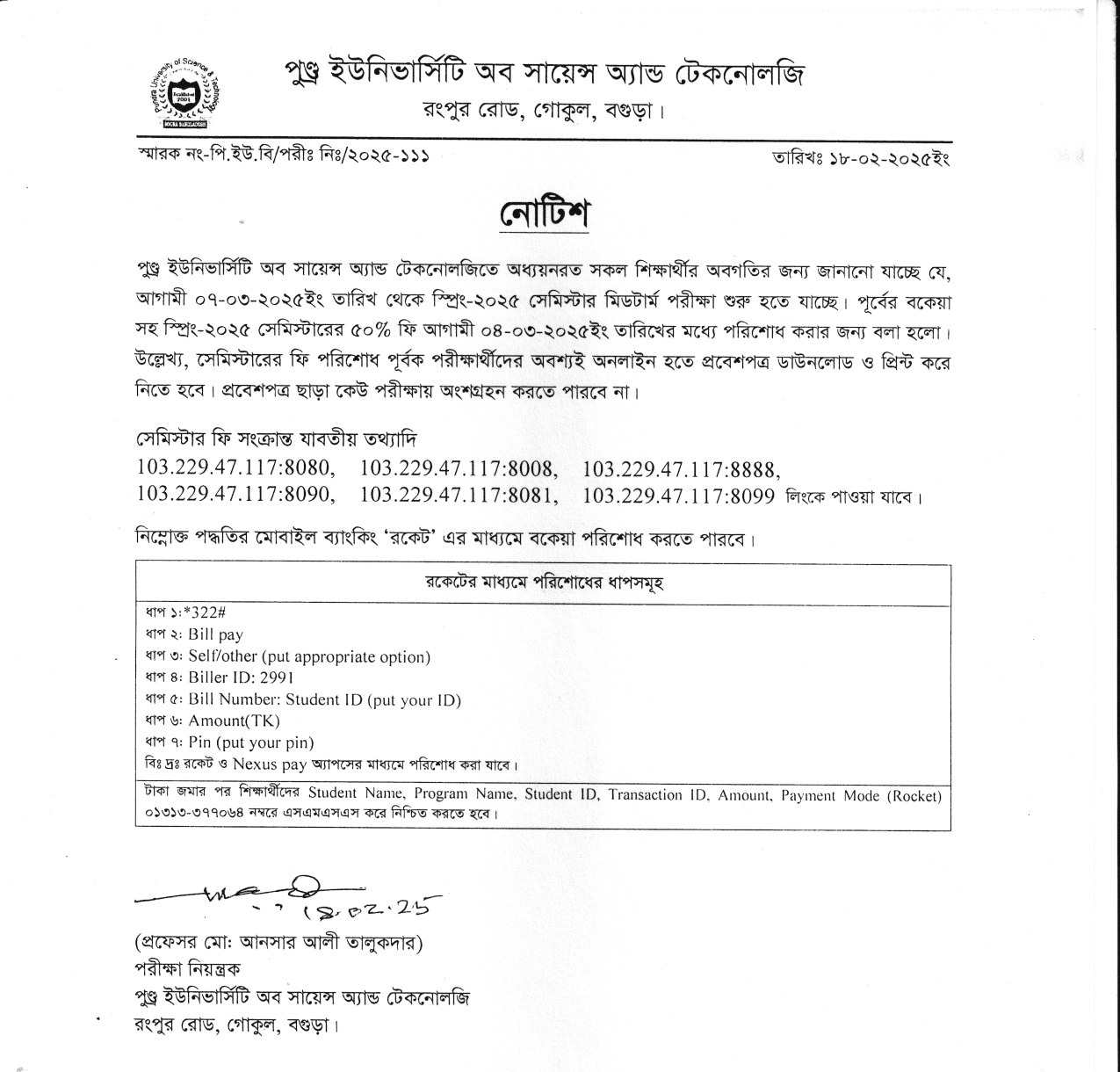 ফিস বকেয়া রেখে সামার-2025 সেমিস্টারের মিডটার্ম পরীক্ষায় ...